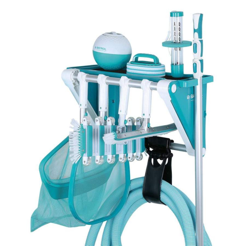 Polyvalent et universel, le porte-accessoires permet de ranger tous vos accessoires de nettoyage de piscine. Compatible avec la plupart des accessoires du marché, il permet de rassembler tous les équipements en un seul endroit. Ce porte-accessoires intègre sur sa partie supérieure une tablette antidérapante pour pouvoir y déposer bandelettes d'analyse d'eau, trousses d'analyse, doseurs flottants ou tout autre petit accessoire de piscine.