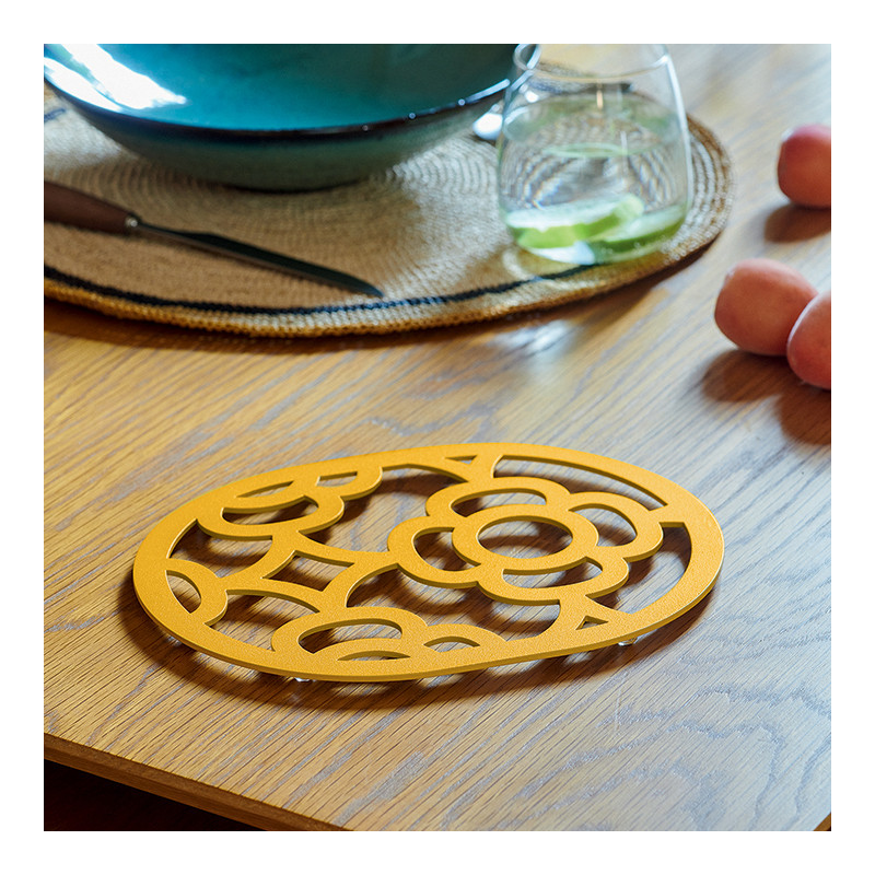 Le dessous de plat 22 x 17,5 de la collection "Lorette" de Fermob incarne l'esprit de la marque avec son motif inspiré des moucharabiehs et sa finesse ornée. Réalisé en métal par découpe laser, il dévoile un monogramme floral raffiné, reflétant l'excellence industrielle. Conçu pour un usage outdoor, il résiste aux UV et aux conditions climatiques. Cet accessoire, fabriqué en France, allie utilité et plaisir esthétique, s'intégrant parfaitement à tout intérieur ou extérieur contemporain, notamment avec une table de la collection Calvi pour une touche d'évasion audacieuse.
