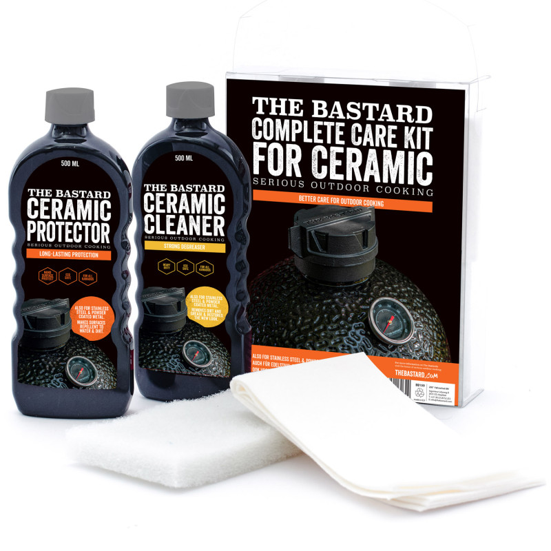 Kit d’entretien entretenir et prolonger la durée de vie de votre barbecue céramique The Bastard, comprenant à la fois un Cleaner 500 ml, un Protector 500 ml, ainsi qu’un chiffon et un tampon à récurer.