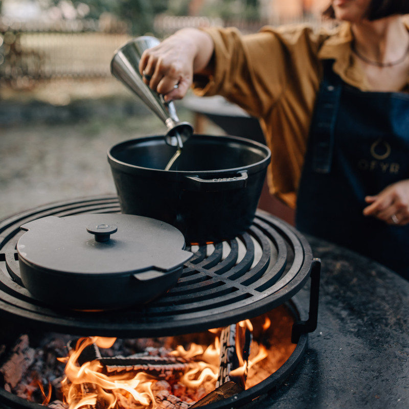 L'ensemble comprend deux poêles en fonte élégantes de 21 cm et 26 cm, idéales pour la plaque de cuisson OFYR. Les casseroles assurent une répartition optimale de la chaleur pour toutes sortes de plats. Le bouton du couvercle peut devenir rouge, nécessitant l'utilisation de gants résistants à la chaleur, pour une manipulation sécurisée. Un ajout fonctionnel et esthétique à votre expérience culinaire OFYR.