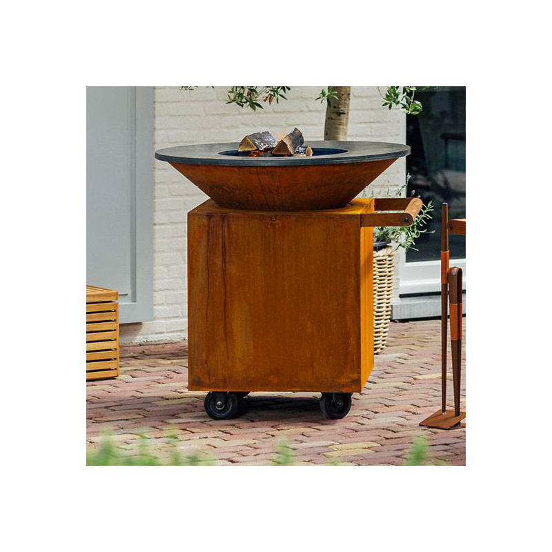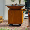 Brasero multifonction en acier Corten de 100 cm, idéal pour cuisiner et créer une ambiance conviviale en extérieur. Grande surface de cuisson adaptée pour jusqu’à 20 personnes. Design modulaire avec socle, cuve et plaque séparables pour un entretien facile. Équipé de roulettes et poignée en teck pour une mobilité pratique.