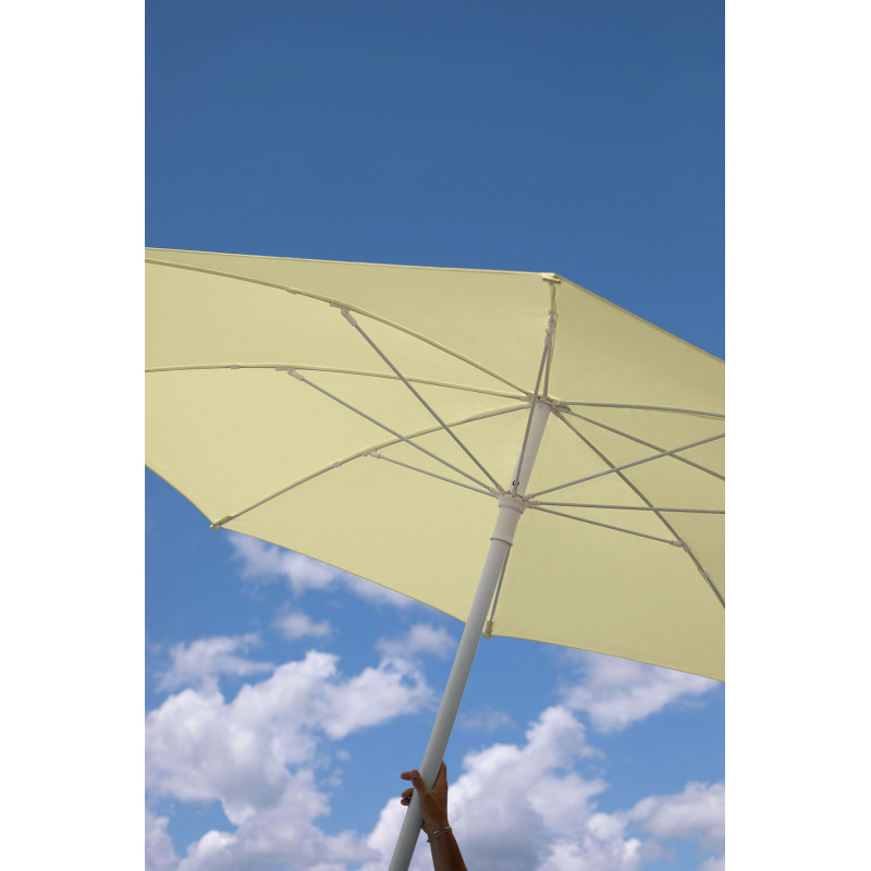 Le parasol rond Shadoo Ø 250 cm associe design épuré et fonctionnalité, parfait pour ombrager terrasse ou coin repas. Sa toile Sunbrella® (260 g/m²) teintée dans la masse résiste aux UV, taches, moisissures et pluie légère. Mât en aluminium et baleines en fibre de verre offrent légèreté, robustesse et maniabilité, avec démontage en deux parties. Ouverture par coulisse clipsable : simple, rapide et fiable, pour un usage intuitif. Compact une fois démonté (avec sac fourni), il se range facilement hors saison tout en ajoutant une touche de couleur pastel à votre extérieur.