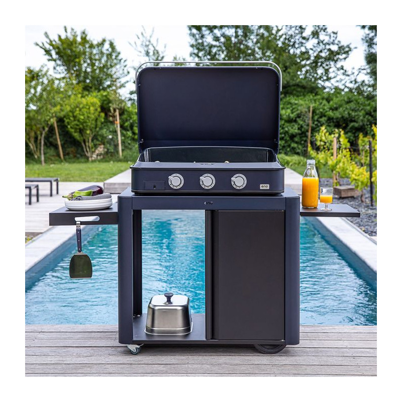La plancha gaz à 3 brûleurs offre un design exclusif avec un assemblage précis et une plaque innovante. Son entretien est facile grâce à la liaison parfaite de la plaque avec le châssis, ses hauts rebords antiprojection et son émail certifié contact alimentaire. Elle garantit une haute performance avec des brûleurs à haut rendement, une diffusion rapide de la chaleur et une double paroi pour un meilleur confinement de la chaleur. Sa robustesse est assurée par son acier galvanisé thermolaqué et sa fonte de 7 mm. De plus, elle est éco-responsable avec un excellent rendement énergétique, des matériaux durables et une fabrication française certifiée.