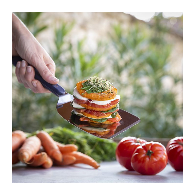 Cet ustensile polyvalent est un indispensable en cuisine, idéal pour manipuler tous types d'aliments et nettoyer la plaque après la cuisson. Son manche ergonomique antidérapant, associé à ses trois rivets en inox traversants, assure une prise en main sécurisée et confortable. Fabriqué en inox spécial pour une souplesse optimale, il est également équipé d'un système d'accroche par suspension pour un rangement pratique. Son équilibre parfait permet de le laisser sur la plaque même lorsqu'elle est chaude. De plus, il est compatible avec le lave-vaisselle, facilitant ainsi son entretien.