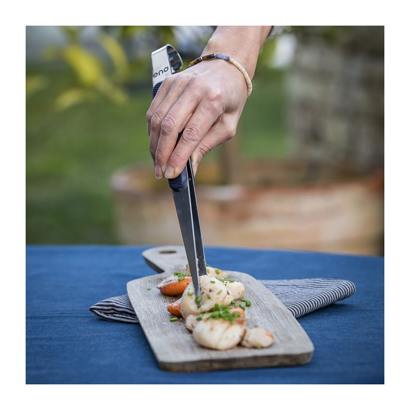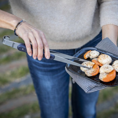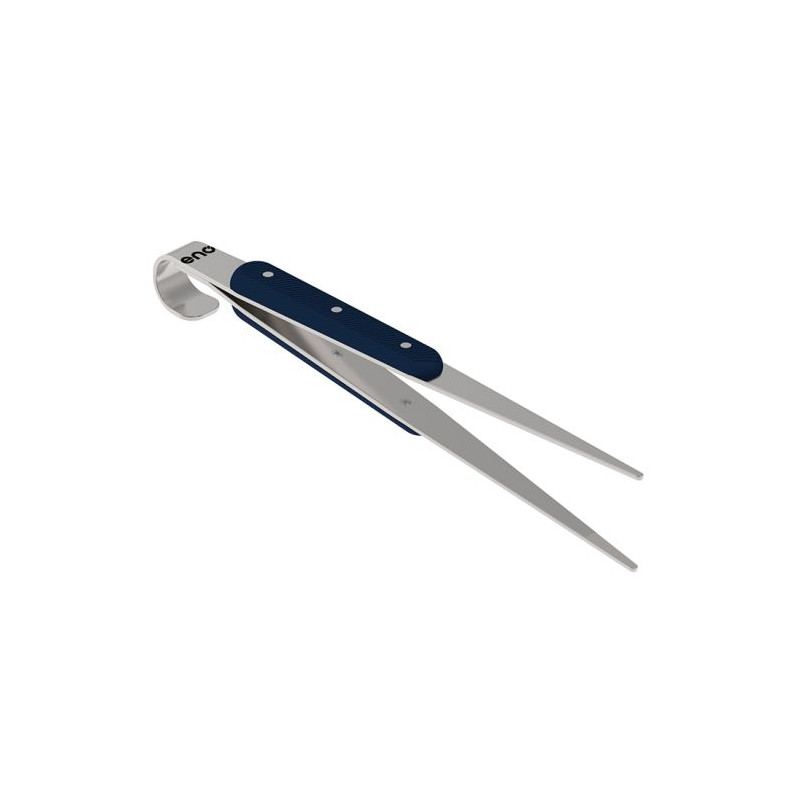 La pince fine en inox est idéale pour manipuler les petites pièces et aliments fragiles, comme les coquilles Saint-Jacques ou les gambas. Son manche ergonomique antidérapant en bleu navy avec trois rivets en inox traversants assure une prise en main sûre. Fabriquée en inox spécial, elle offre une grande souplesse et flexibilité. Dotée d'un système d'accroche par suspension, elle reste pratique à ranger. De plus, elle est compatible avec le lave-vaisselle pour un nettoyage facile.