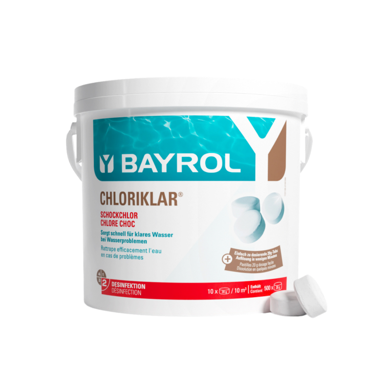 Chloriklar® est un chlore à dissolution rapide en pastilles effervescentes. Idéal en cas de problème d'eau verte, eau marron ou d'eau trouble. Ce traitement choc détruit toutes les bactéries, élimine les impuretés rapidement et permet de retrouver rapidement une eau saine et cristalline.