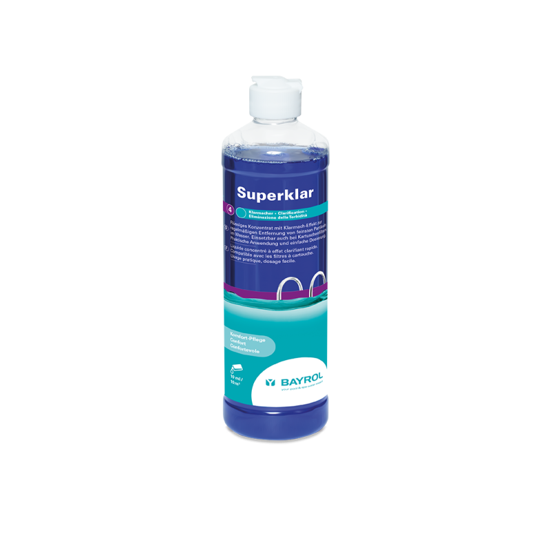 Liquide clarificateur d'eau, Superklar agit efficacement sur les particules en suspension, assurant une eau cristalline rapidement. Sa formule brevetée concentrée couvre toute la saison avec un flacon pour une piscine de 40m³. Idéal pour les filtres à cartouche, mais convient aussi aux filtres à sable ou verre sans altérer le pH.