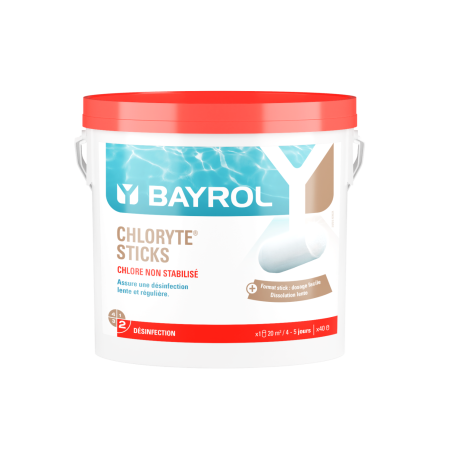 Les sticks Chloryte® sont des sticks d’hypochlorite de calcium, un chlore non stabilisé. Le stick, à dissolution lente, agit comme traitement régulier pour une désinfection permanente du bassin. Sans stabilisant de chlore, il permet de traiter les piscines sans risque de sur-stabilisation.