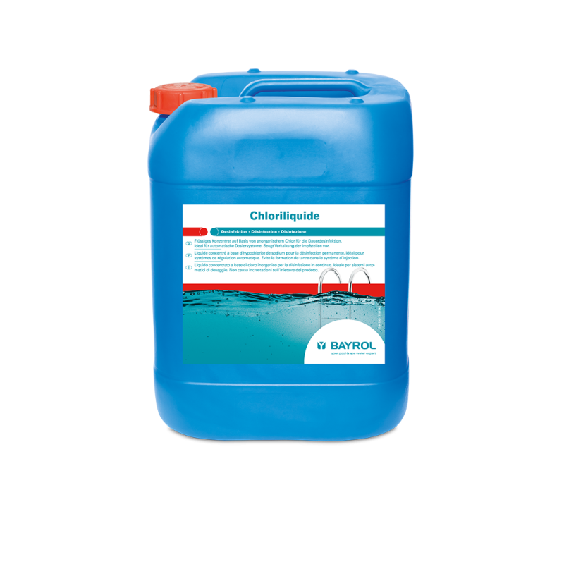 Chloriliquide de Bayrol est un chlore liquide non stabilisé (hypochlorite de sodium à 12,7 % de chlore actif) conçu pour la désinfection continue des piscines via un système de régulation automatique. Sa formule intègre un stabilisateur de dureté pour prévenir les dépôts calcaires dans les équipements. Entièrement soluble, il n'altère pas le pH de l'eau et convient à tous types de filtres et volumes de bassins. Le dosage s'effectue automatiquement pour maintenir un taux de chlore optimal entre 0,5 et 1 mg/L.