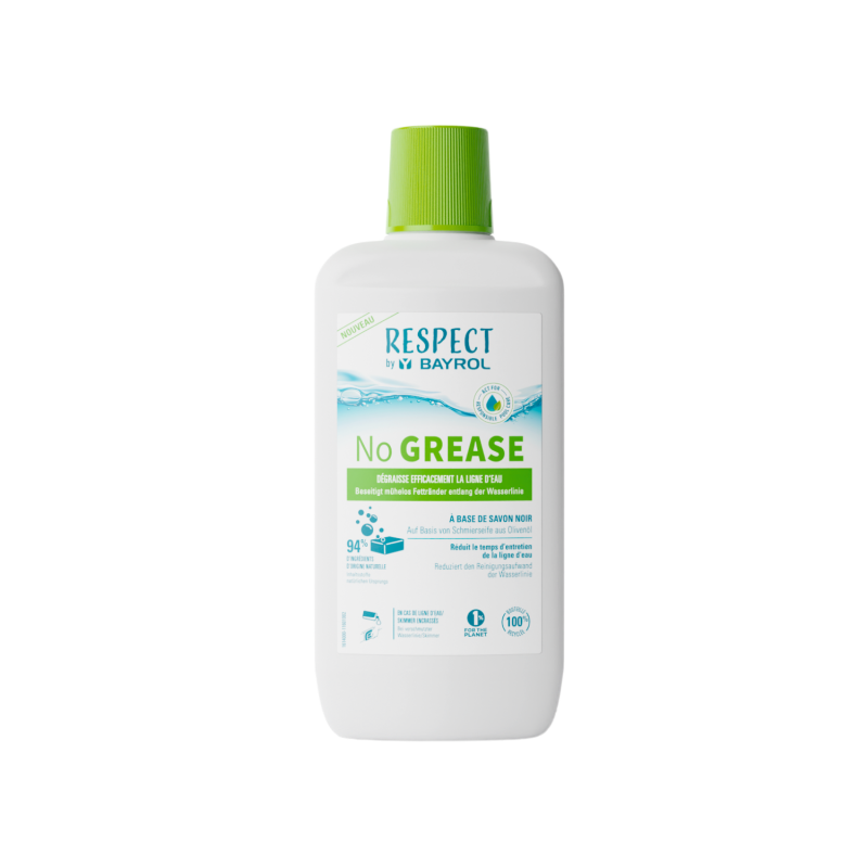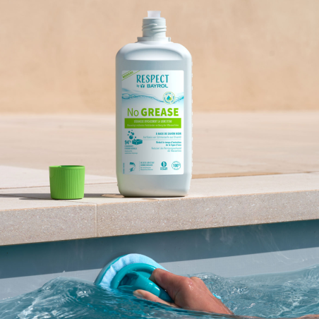 No GREASE dégraisse efficacement la ligne d'eau et les skimmers. Il élimine les dépôts gras issus des baigneurs, des résidus de crèmes et huiles solaires ou encore de la pollution de l'air. No GREASE est un nettoyant liquide concentré alcalin formulé à base de savon noir d'origine naturelle.
