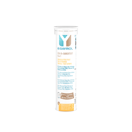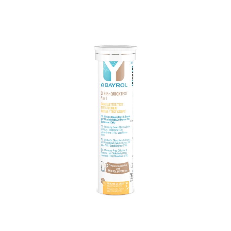 Bandelettes test piscine pour mesurer le Chlore libre & Brome, pH, Alcalinité (TAC), Durété totale (TH) et Stabilisant (CYA). 5 paramètres clés analysés en un seul geste.